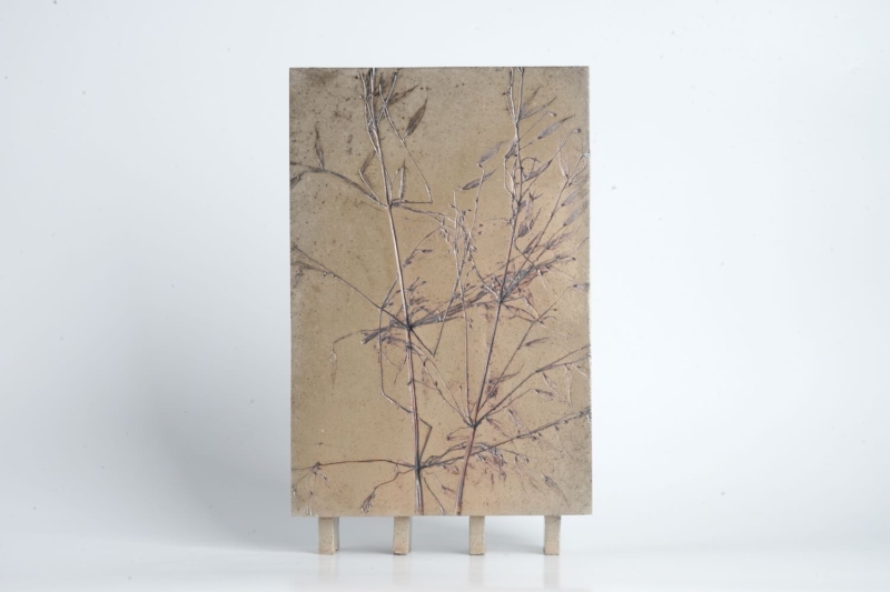 Die Vase wird aus hochwertigem, im Holzfeuer gebrannten Steinzeug gefertigt. Auf der Oberfläche ist Flug-Hafer abgedrückt, deren feine Konturen mithilfe von Metalloxiden subtil hervorgehoben wurden. Dadurch entsteht eine authentische, organische Textur, die jedem Stück seinen eigenen Charakter verleiht.