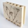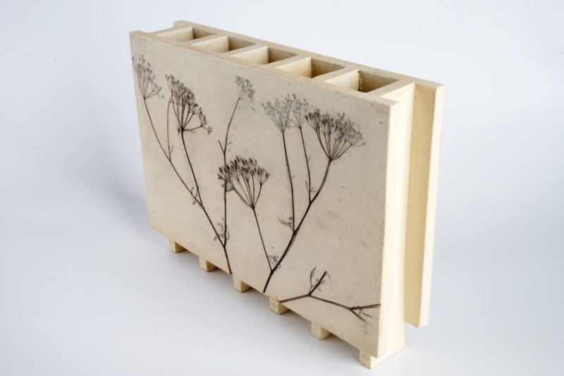 Die Vase wird aus hochwertigem, im Holzfeuer gebrannten Steinzeug gefertigt. Auf der Oberfläche ist eine Sichelmöhre abgedrückt, deren feine Konturen mithilfe von Metalloxiden subtil hervorgehoben wurden. Dadurch entsteht eine authentische, organische Textur, die jedem Stück seinen eigenen Charakter verleiht.