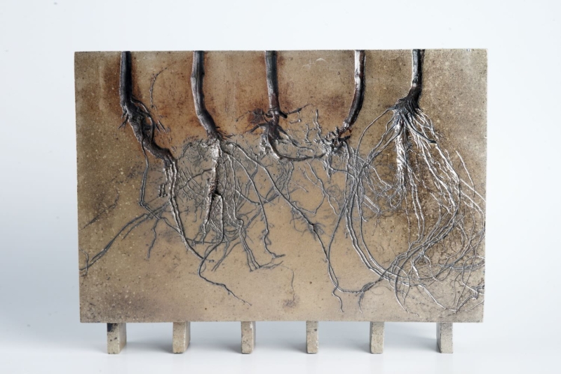 Die Vase wird aus hochwertigem, im Holzfeuer gebrannten Steinzeug gefertigt. Auf der Oberfläche ist weißer Gänsefuß abgedrückt, deren feine Konturen mithilfe von Metalloxiden subtil hervorgehoben wurden. Dadurch entsteht eine authentische, organische Textur, die jedem Stück seinen eigenen Charakter verleiht.