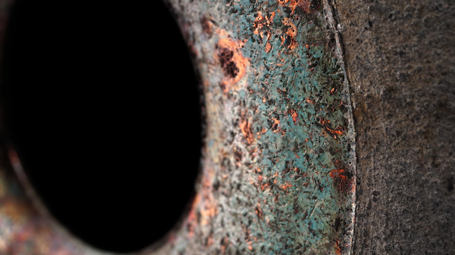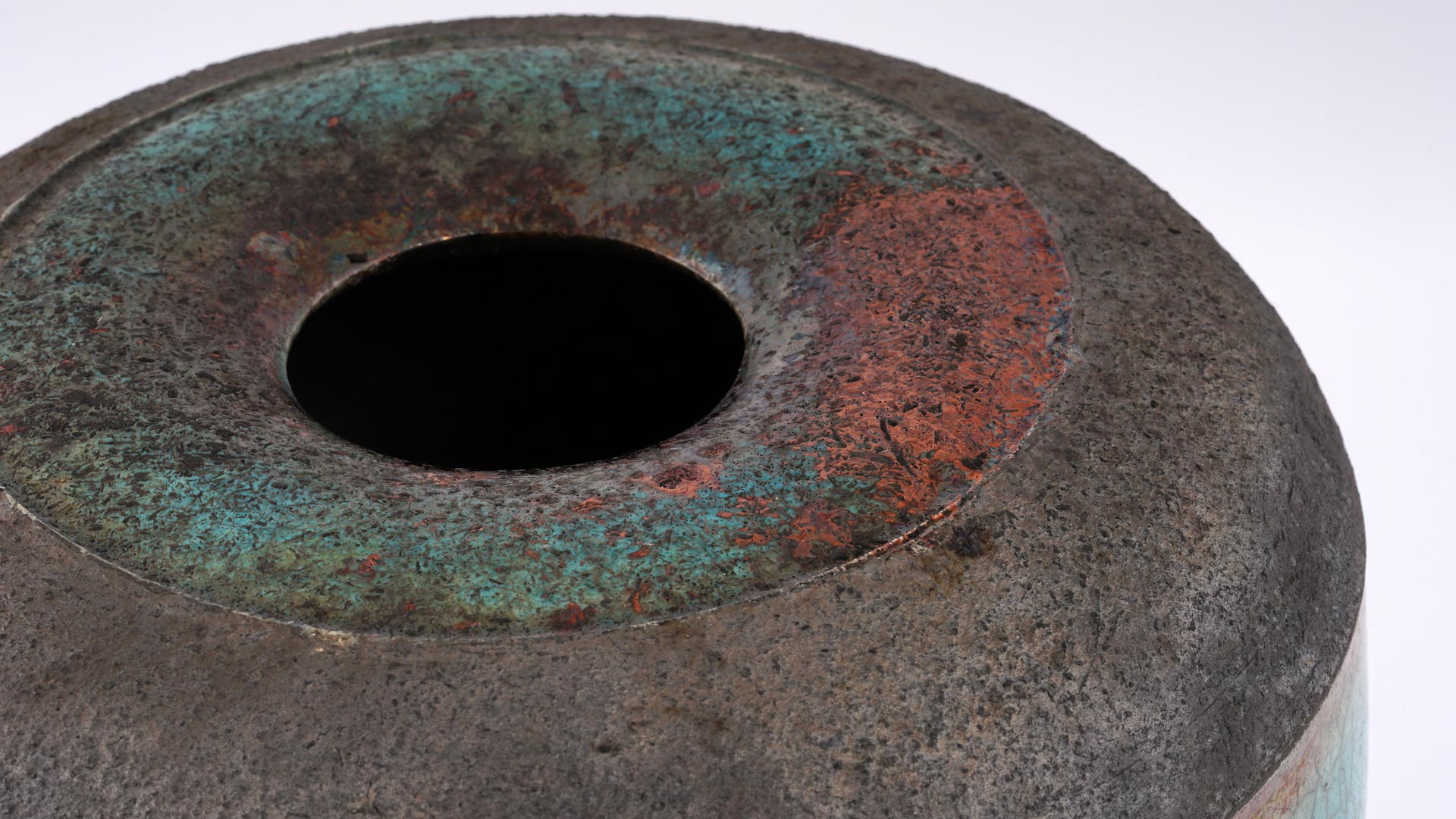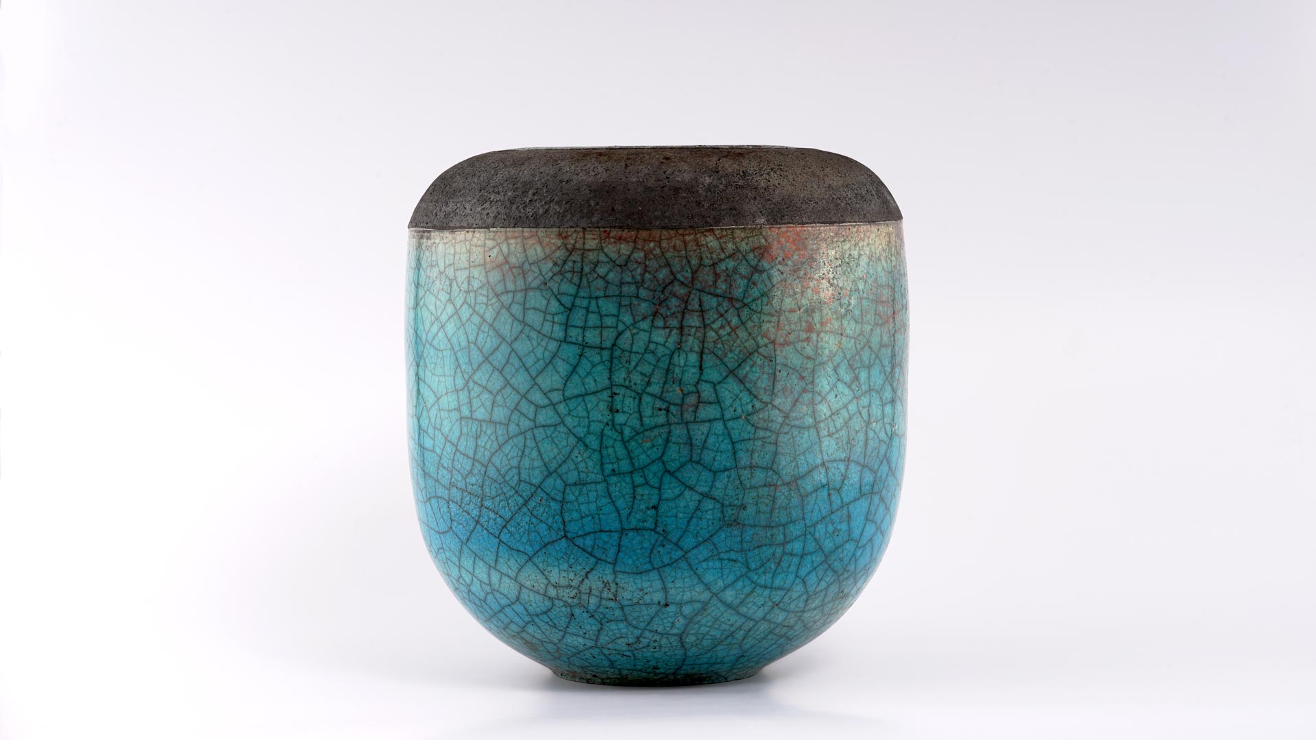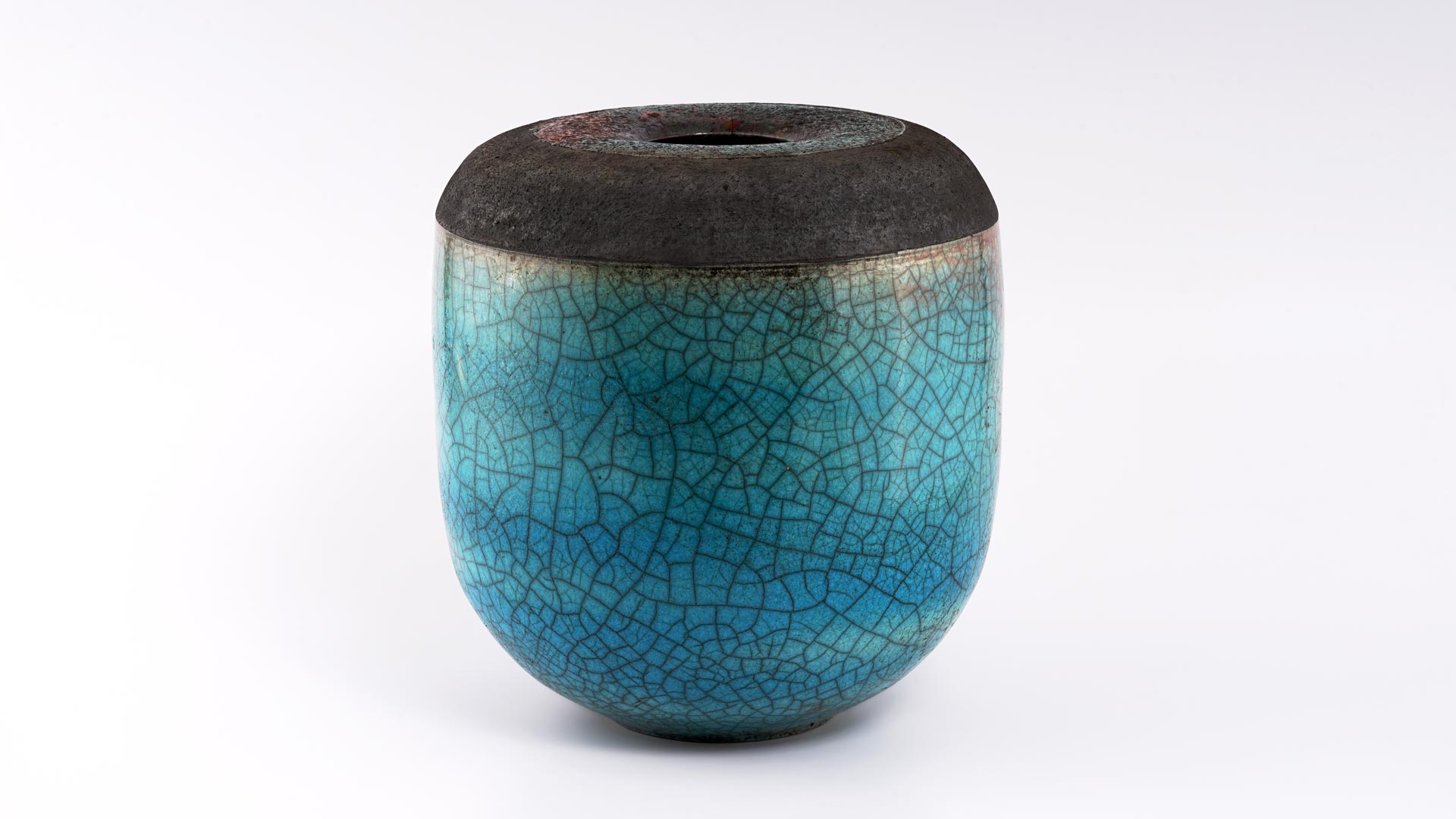 Ein Rakugefäß in den Farben des tyrrhenischen Meeres. Dieses hohe geschlossene Gefäß besticht durch die für Raku typische türkise Craqueléglasur. Die Farbe Türkis beruht bei Raku auf Kupferoxid, welches stellenweise zu metallischem Kupfer reduziert wird und so goldene Ausscheidungen macht.
